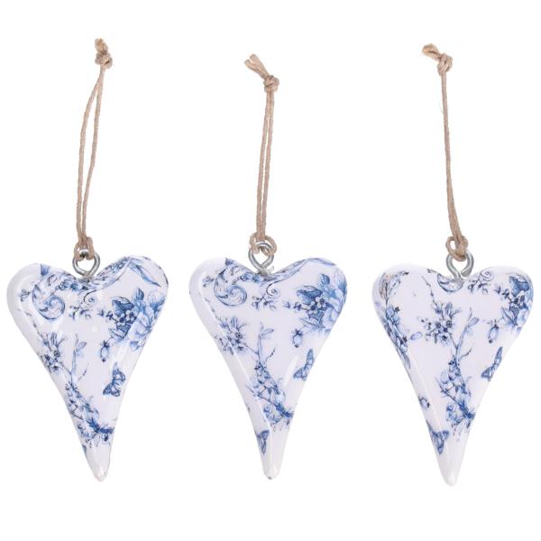 Flache Herzen Holz Druckmotiv in der Farbe Weiss Blau mit Öse und Hänger.