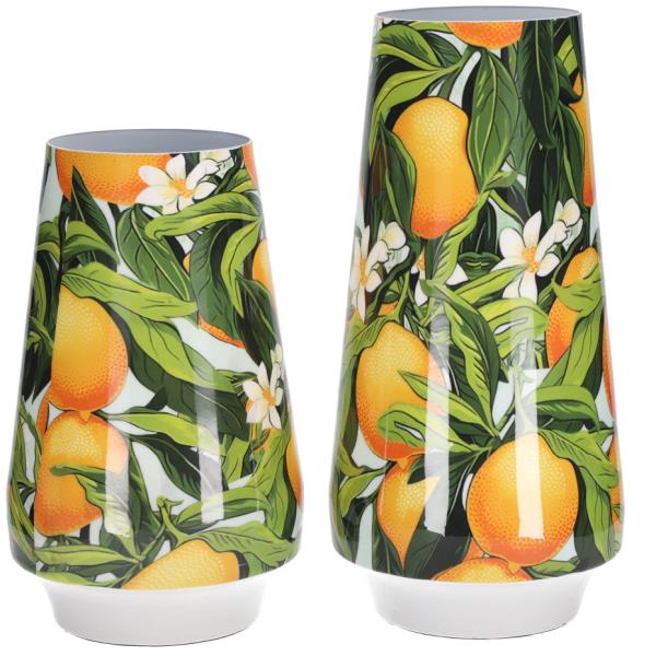Emaillierte Blumenvase Metall, Orange Motiv und Blüten als Druckmotiv. Stilvolle Vase für jede Einrichtung, harmonische Form modern und zeitlos für einen ganzjährigen Einsatz.